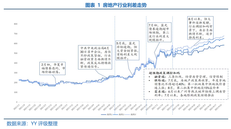 政策調(diào)控背景下,華夏幸福、藍光以及恒大等主體負面輿情不斷,7月以來,接連負面輿情釋放導(dǎo)致行業(yè)局面持續(xù)悲觀,而政策繼續(xù)加碼,負面情緒釋放進一步推高利差走擴,而隨著花樣頻出,市場的信心仍在進一步下墜中。