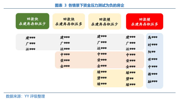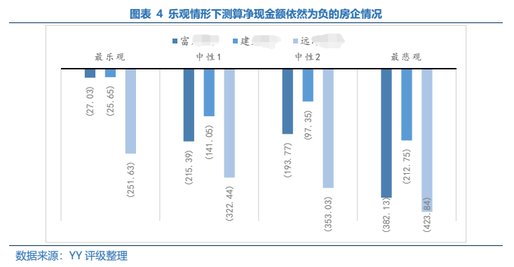 在最樂觀情形下,F(xiàn)L、JY等名字主體,仍是有資金缺口;而在中性1組合下,則RS、JK等接連扛不住,緊接著中性壓力測試2下則是Grennland等也加入陣營,而在去化和回款雙重降幅悲觀預(yù)期下,此前的YZ、ZN等主體紛紛中招。殺傷面之廣,似乎壓力的進行仍在進行中。