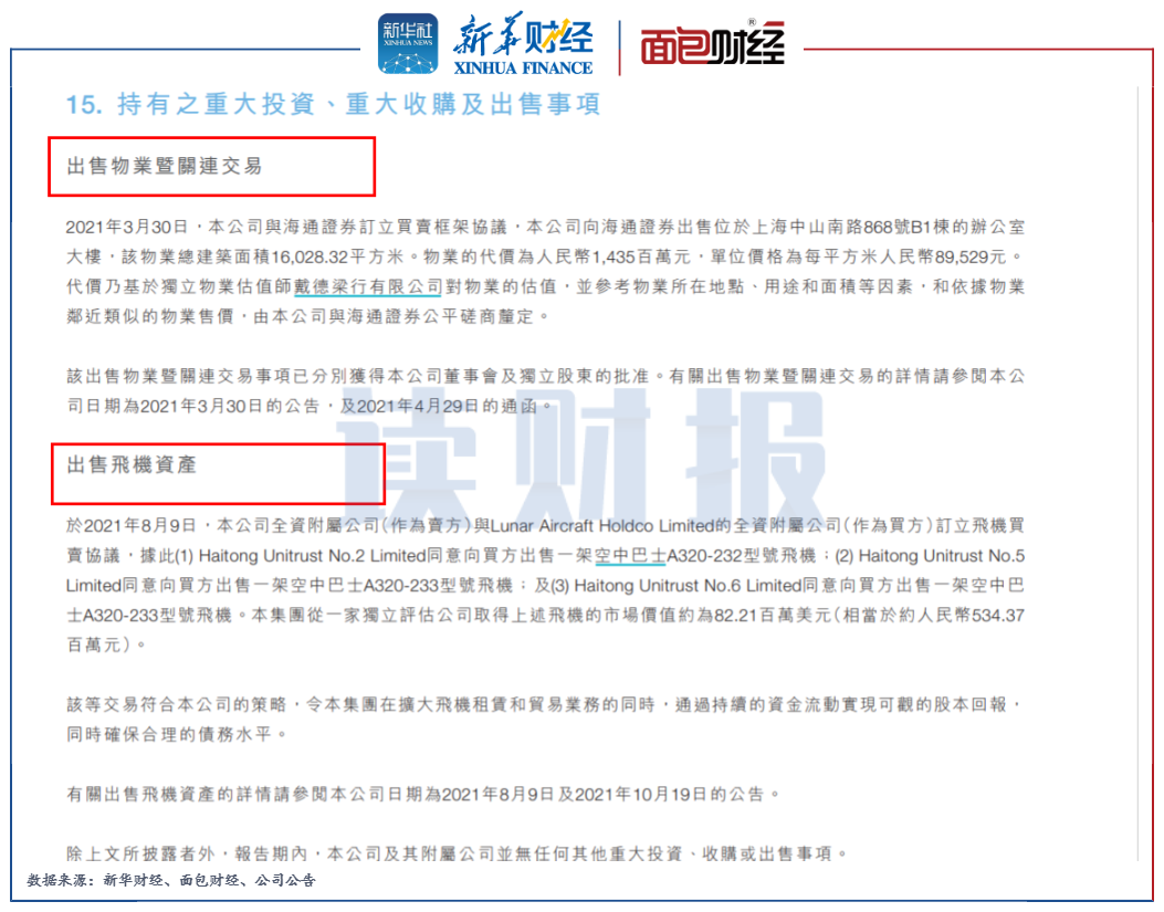 此外,根據海通恒信2021年年報,該公司當年發生兩次重大的出售事項,一次是向海通證券出售辦公室大樓,一次是出售2架飛機,上述資產的評估價值分別為14.35億元和5.34億元。