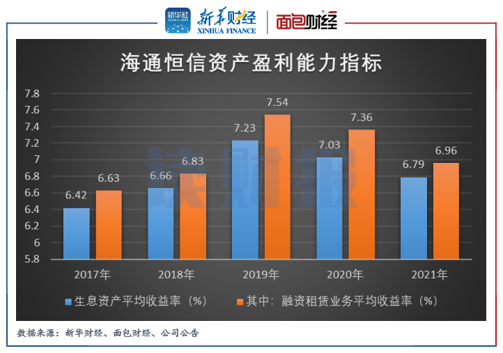 研究發現,海通證券融資租賃子公司海通恒信的資產盈利能力有所下滑。2021年,該公司的生息資產平均收益率和融資租賃業務平均收益率分別為6.79%和6.96%,同比分別下降0.24個百分點和0.4個百分點。
