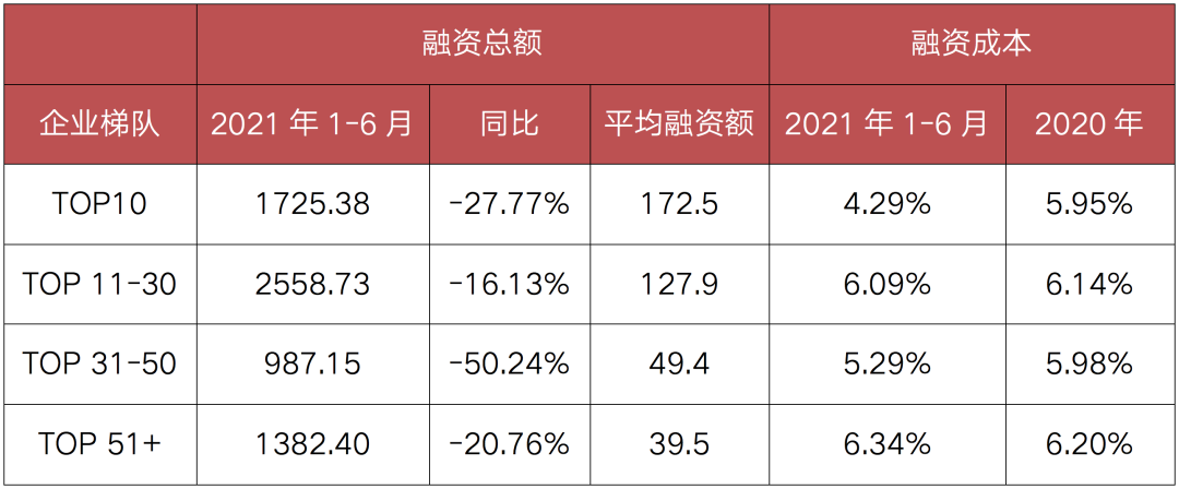 從梯隊(duì)上來(lái)看,四個(gè)規(guī)模梯隊(duì)的房企融資量均呈現(xiàn)同比下降,其中TOP31-50的房企下降幅度最大,同比減少53.50%至922億元,而TOP11-30規(guī)模的房企融資規(guī)模下降幅度為23.48%,降幅最小,主要在于該梯隊(duì)的房企規(guī)模增長(zhǎng)訴求較大,雖在融資收緊下融資量有所下滑,但仍保持較為相對(duì)積極的融資態(tài)度。