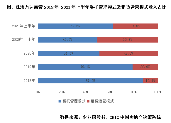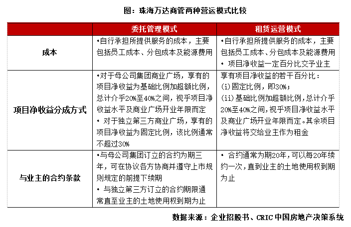 從業務模式來看,目前珠海萬達采取委托管理和租賃運營兩種模式,企業均有權享有項目凈收益的20%—40%作為公司收益。根據企業招股書介紹,委托管理模式主要是受委托全權負責管理商業廣場,而租賃運營模式則是從業主處租賃物業,并將商業廣場內的商業空間出租給商戶,同時全權負責管理商業廣場,租賃運營模式與委托管理模式的服務范圍大體一致。不過萬達的租賃運營模式與行業傳統型的租賃運營模式不同,主要為收益分成型。