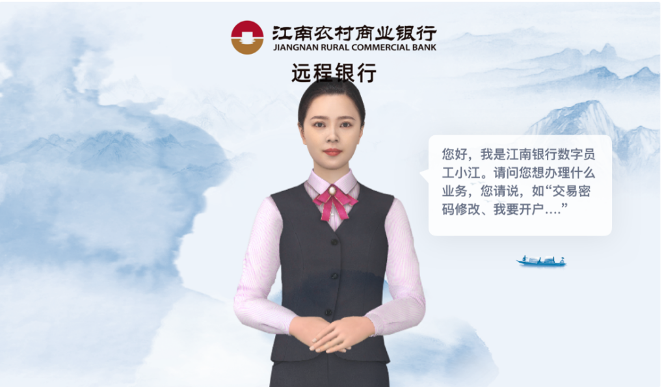 在“全國前十大農商行排行榜”中,江南農商銀行位列第8位,很大程度上得益于其在金融智能化轉型道路上的領跑。過去兩年里,江南農商行銀行與京東金融云合作打造了VTM(虛擬柜員機)數字員工,是全國首個能獨立、全程辦理銀行真實交易的數字人,形成了多渠道、全場景、端到端的VTM數字人解決方案。目前該項目已在江南農商銀行多個網點部署,并取得了良好的效果。