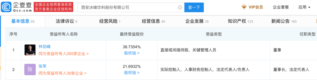 企查查顯示,糖酒集團持有冰峰飲料99%股權,還通過全資子公司——久悅酒業持股1%。糖酒集團董事長兼總經理張軍,同時擔任冰峰飲料董事長職務,最終持股21.70%。盈信投資集團董事長林勁峰間接持股38.73%。