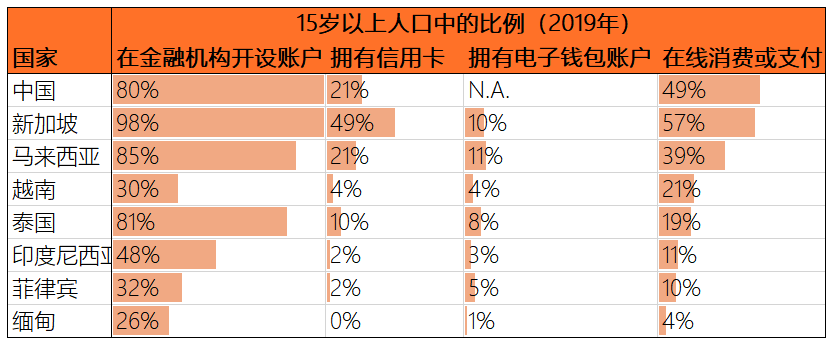 根據(jù)2019年中金公司研究部數(shù)據(jù),在傳統(tǒng)金融業(yè)務(wù)方面,新加坡、馬來西亞和泰國(guó)15歲以上人口在金融機(jī)構(gòu)開設(shè)賬戶比例超過80%,印尼、越南、緬甸均不足50%,具有較大的提升空間。除新加坡以外,東南亞其他主要國(guó)家15歲以上人群擁有信用卡的比例均不到25%,其中越南、印尼、菲律賓、緬甸甚至不足5%;另一方面在數(shù)字金融業(yè)務(wù)方面,使用在線消費(fèi)或支付的15歲以上人口在總?cè)丝诒壤行录悠聝?yōu)勢(shì)明顯占比為57%,馬來西亞和越南為39%和21%,泰國(guó)、印尼和菲律賓在10%-20%之間,緬甸則為4%,在線金融業(yè)務(wù)發(fā)展緩慢,相比49%的15歲以上中國(guó)人進(jìn)行在線消費(fèi)或支付,均有較大的發(fā)展空間。