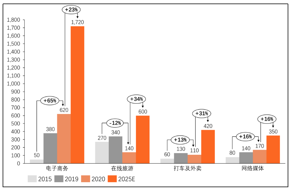 分行業(yè)看,2020年?yáng)|南亞電子商務(wù)、在線旅游、打車及外賣服務(wù)、網(wǎng)絡(luò)媒體GMV則分別為620億美元、140億美元、110億美元、170億美元,2015年-2020年年均復(fù)合增長(zhǎng)率分別為65%、-12%、13%、16%。其中電商占東南亞互聯(lián)網(wǎng)經(jīng)濟(jì)整體規(guī)模59.6%,其他三類則占比在15%左右,主要是由于2020年受新冠疫情影響,在線旅游和交通出行行業(yè)出現(xiàn)了萎縮,電商和網(wǎng)絡(luò)媒體的快速增長(zhǎng)一定程度抵消了其負(fù)面影響。預(yù)計(jì)2025年電子商務(wù)、在線旅游、打車及外賣服務(wù)、網(wǎng)絡(luò)媒體GMV將分別達(dá)到1720億美元、600億美元、420億美元和350億美元,預(yù)計(jì)2020年-2025年年均復(fù)合增長(zhǎng)率將達(dá)到23%、34%、31%、16%。