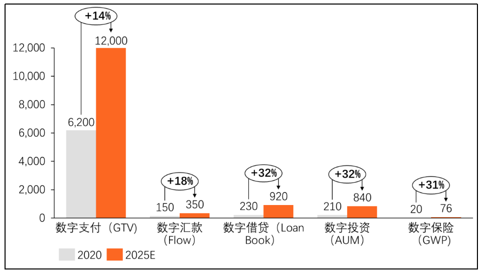 其中數(shù)字支付服務(wù)發(fā)展規(guī)模最大,目前數(shù)字支付總交易額(GTV)已達(dá)6200億美元,預(yù)計(jì)2025年總交易額(GTV)將達(dá)到12000億美元,主要來源于電商、打車等線上交易服務(wù)帶來的支付驅(qū)動(dòng)。此外盡管其他金融服務(wù)仍然處于初級(jí)數(shù)字化階段,但是據(jù)預(yù)測(cè)2020至2025年未來五年內(nèi),數(shù)字匯款、借貸、投資和保險(xiǎn)的滲透率將會(huì)有兩到三倍的增長(zhǎng),依次達(dá)到28%、8%、11%、9%。預(yù)計(jì)2020年-2025年均復(fù)合增長(zhǎng)率將依次達(dá)到18%、32%、32%、31%。