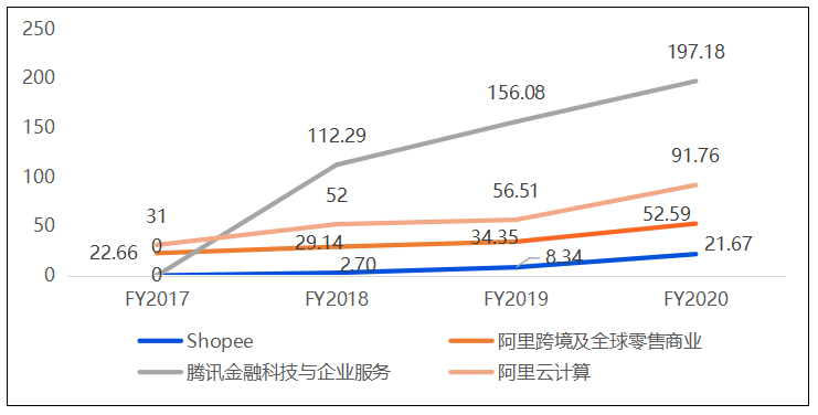 注:1.Shopee為騰訊投資東南亞電商公司;2.阿里跨境零售營(yíng)收包括自營(yíng)東南亞電商Lazada、速賣通、土耳其電商Trendyol;3.騰訊云計(jì)算業(yè)務(wù)營(yíng)收目前屬于金融科技與企業(yè)服務(wù)類目