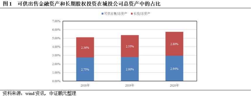 (2)城投公司開展金融投資在財報中最直接、最集中地體現(xiàn)在兩個科目中,一是“可供出售金融資產(chǎn)”,另一個是“長期股權(quán)投資”,2018-2020年上述兩大科目的期末余額在總資產(chǎn)中的占比均值之和分別為5.11%、5.35%、5.74%,而其他科目的期末余額在總資產(chǎn)中的占比均值之和分別為0.09%、0.30%、0.31%,另外,兩大科目的期末余額在總資產(chǎn)中的占比相差不大(見圖1);