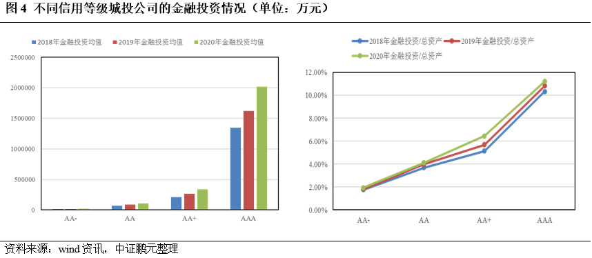(4)從級別來看,城投公司開展金融投資的活躍度與主體信用級別呈現(xiàn)顯著的正相關(guān)。2018-2020年,AA-、AA、AA+、AAA級主體的金融投資規(guī)模均值、金融投資/總資產(chǎn)的均值都呈現(xiàn)出由低到高的態(tài)勢,且AAA級主體與其他級別相比,優(yōu)勢極為突出,2020年AAA級主體的金融投資均值高達(dá)202.21億元,金融投資占總資產(chǎn)的比重也達(dá)到了11.22%(見圖4),這反映出高級別主體相較低級別主體具備更多的能力、資源去開展金融投資,同時也提示了一個關(guān)鍵信息:信用等級較低的城投公司對于金融投資應(yīng)保持足夠的謹(jǐn)慎,避免因能力和資源的缺乏而導(dǎo)致較大的投資損失,從而進(jìn)一步拖累自身信用資質(zhì)。