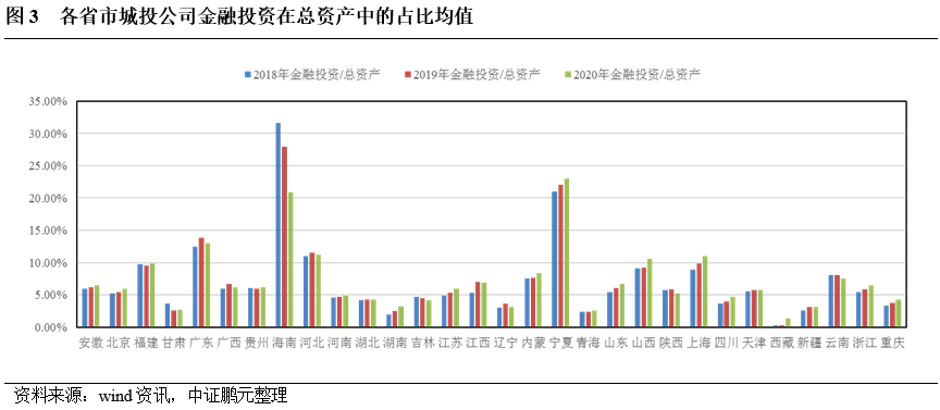 (3)從區(qū)域來看,城投公司在金融投資上的分化較為明顯。北京、天津、上海、廣東、海南、寧夏等地的城投公司表現(xiàn)得最活躍,河北、山西、山東、廣西、云南等地的城投公司處于第二梯隊,安徽、江蘇、浙江、重慶、陜西、江西等地的城投公司活躍度一般,河南、湖北、湖南、青海、新疆、西藏等地的城投公司活躍度很低(見圖2)。總體來看,城投公司金融投資的活躍度與其所屬區(qū)域的金融發(fā)展水平以及城投公司的數(shù)量多寡、資信水平、轉(zhuǎn)型深度等密切相關(guān)。部分區(qū)域的經(jīng)濟(jì)財政實力、金融發(fā)展水平較高,但由于轄區(qū)內(nèi)城投公司數(shù)量較多且資信水平層次不齊,故在金融投資上的平均水平被拉低,如江蘇、浙江;部分區(qū)域的經(jīng)濟(jì)財政實力、金融發(fā)展水平一般,但轄區(qū)內(nèi)僅有幾家核心城投公司且資信水平均較高,故在金融投資上的平均水平被推高,如海南、寧夏(見圖3)。