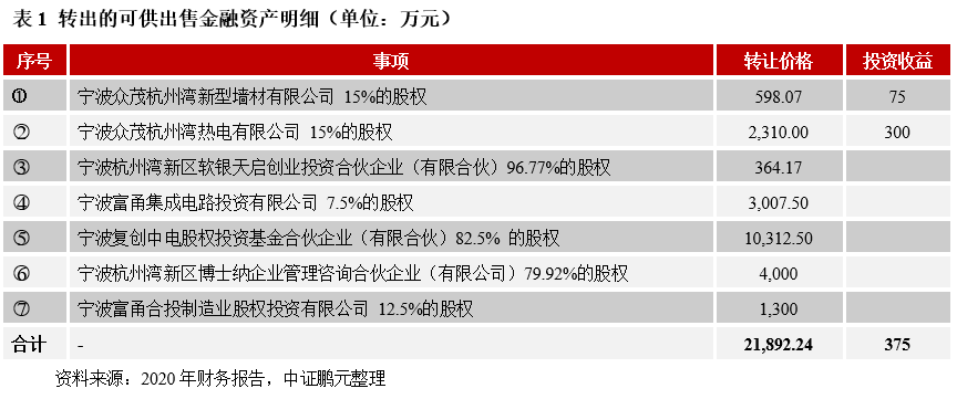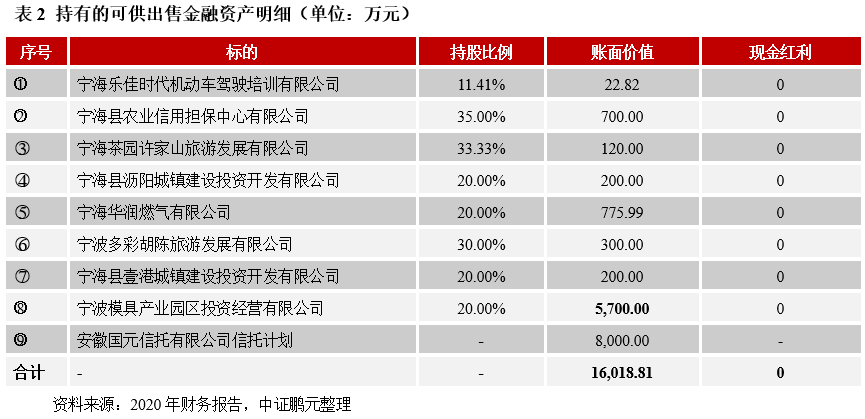 再以寧波杭州灣新區(qū)開發(fā)建設(shè)有限公司為例。2020 年末,公司可供出售金融資產(chǎn)余額由上年末的1.83 億元減少至0,主要系因公司根據(jù)杭州灣新區(qū)管委會相關(guān)文件與區(qū)域內(nèi)其他國企之間進(jìn)行了資產(chǎn)整合劃轉(zhuǎn),其中公司轉(zhuǎn)出的資產(chǎn)中包括了其持有的按成本計量的可供出售權(quán)益工具(明細(xì)如下),轉(zhuǎn)讓價款合計21,892.24萬元。此外,2020年公司收到寧波眾茂杭州灣新型墻材有限公司和寧波眾茂杭州灣熱電有限公司的現(xiàn)金分紅款,共計375萬元,計入投資收益,占當(dāng)年營業(yè)利潤的比重僅為3.20%,對公司盈利的貢獻(xiàn)度較低。