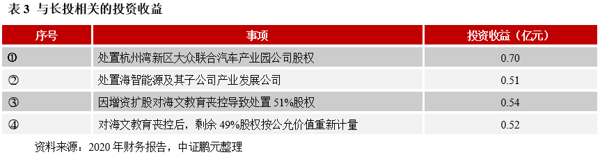 再以寧波杭州灣新區(qū)開發(fā)建設(shè)有限公司為例。2020年底,其長投余額為36.58 億元,較上年末增長12.66%。具體來看,該部分資產(chǎn)包括33.43億元的對合營企業(yè)投資和3.15億元的對聯(lián)營企業(yè)投資,均按權(quán)益法核算。其中,對合營企業(yè)投資中主要有對慈溪市開發(fā)公司投資32.72億元、對杭州灣新區(qū)濕地建設(shè)公司投資0.44億元;對聯(lián)營企業(yè)投資中主要有對杭州灣新區(qū)中石化油站發(fā)展公司投資0.55億元和對杭州灣新區(qū)海文教育發(fā)展公司投資1.76億元。相較2019年底,長投的增長主要來自于兩點:一是,慈溪開發(fā)公司本期資本公積增加 4.00 億元,“長期股權(quán)投資-其他權(quán)益變動”隨之增加;二是,原合并范圍內(nèi)孫公司海文教育于2020年12月28日引入外部投資者(浙江綠城房地產(chǎn)投資有限公司),增資擴(kuò)股導(dǎo)致公司之全資子公司寧波杭州灣濱海新城開發(fā)建設(shè)有限公司對其喪失控制權(quán),故對相關(guān)長投視同處置后重新取得,也即按照增資擴(kuò)股后的被投資單位凈資產(chǎn)份額確認(rèn)新的投資成本,同時在合并報表中對喪控后剩余股權(quán)按照公允價值重新計量,最終確認(rèn)1.76億元的對聯(lián)營企業(yè)投資。2020年,公司實現(xiàn)1.17億元營業(yè)利潤,其中投資收益1.75億元(見表3),反映出公司盈利對投資收益的依賴度極高。