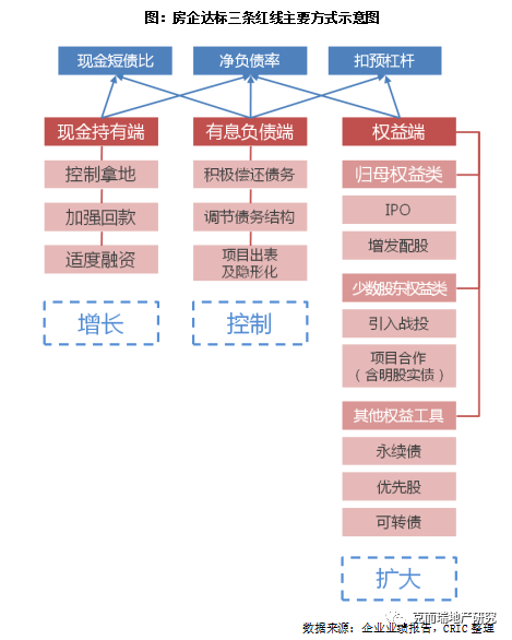 整體來看,房企要達(dá)標(biāo)三條紅線,主要選擇了以下三個方面著手,分別是現(xiàn)金持有端、有息負(fù)債端及權(quán)益端。其中現(xiàn)金持有端,主要影響現(xiàn)金短債比及凈負(fù)債率指標(biāo):主要表現(xiàn)為提升經(jīng)營方面的現(xiàn)金回款,同時控制投資支出,保證適度的融資規(guī)模,以保障在手現(xiàn)金的充足。