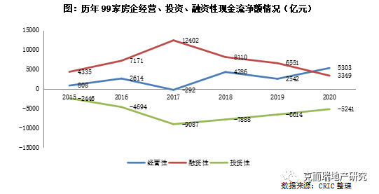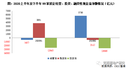 若從99家房企2020年上半年及下半年經(jīng)營、投資、融資性現(xiàn)金流凈額變化來看,可以看出大多數(shù)房企于下半年加強(qiáng)銷售回款、控制投資,經(jīng)營性現(xiàn)金流由負(fù)轉(zhuǎn)正至5790億元;而投資性現(xiàn)金流基本保持持平。與此同時,融資性現(xiàn)金流凈額呈現(xiàn)為凈流出,側(cè)面也說明房企加大了債務(wù)償還力度。