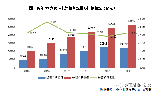 總有息負(fù)債微降,主要是由于短期有息負(fù)債的減少所致。2020年末99家房企的短期有息債24722億元,相比2019年下降了2%,為歷年來首次出現(xiàn)下滑,相比2020上半年大幅下降了10%。但值得注意的是,2020年末長期有息負(fù)債較2019年上升了9%至53197億元,此外較2020年中上升了3%。這主要由于下半年房企通過借新還舊,調(diào)整了債務(wù)結(jié)構(gòu)。在此背景下,房企2020年末的長短期債務(wù)比達(dá)2.15,較2019年及2020年中,均有明顯改善。