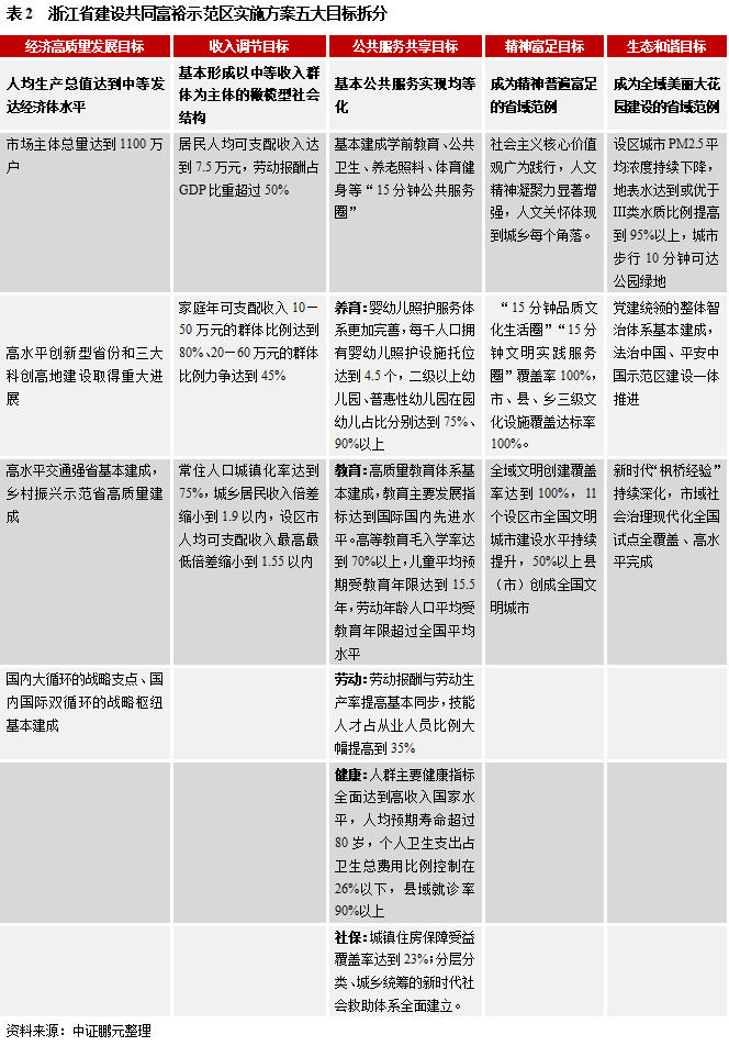 浙江省建設共同富裕示范區包含經濟、收入、公共服務等五個目標。細化來看,目標包含GDP總量、可支配收入、中等收入占比、公共文化服務圈、社會保障等量化目標。這一方案或將成為《促進共同富裕行動綱要》中的績效參考。