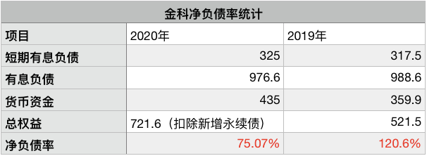 從財務報表中分析來看,金科的有息負債應該為976.7億元,貨幣資金為435億元,計算凈負債率時,總權益數據735億元,應該是減去了2020年8月之后新增的13.42億元永續債(監管要求),即總權益為721.58億元。