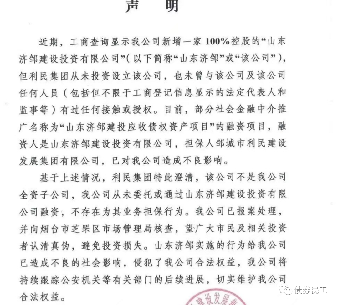 2021年12月10日,鄒城市利民建設發展集團有限公司(以下簡稱“鄒城建發”)發布聲明,工商查詢顯示新增一家100%控股的“山東濟鄒建設投資有限公司”,該公司不是公司的全資子公司。鄒城建發從未委托或通過山東濟鄒建設投資有限公司融資,不存在為其業務擔保行為。