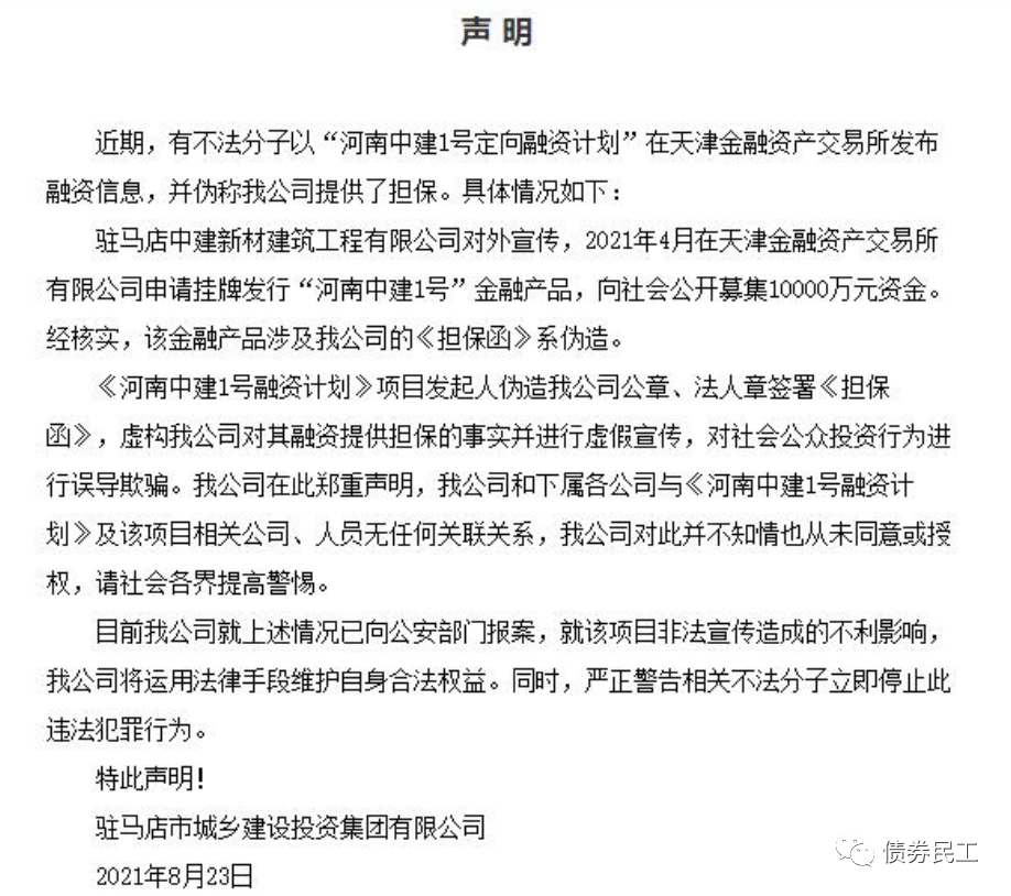 2、2021年8月23日,駐馬店市城鄉建設投資集團有限公司發布聲明表示,有不法分子以“河南中建1號定向融資計劃”在天津金融資產交易所發布定融產品信息,偽造了公司的擔保函。