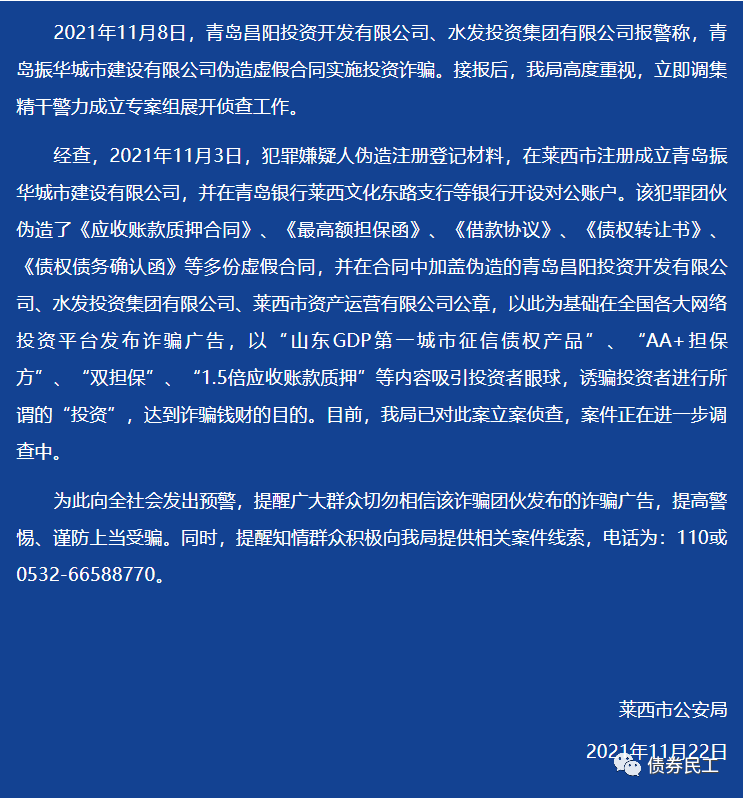 1、2021年11月22日,某李鬼城投公司(青島振華城市建設有限公司)假冒“水發投資集團有限公司”和“萊西市資產運營有限公司”的名義在某平臺發行定融產品“青島萊西振華城建2021應收債權”,直接被公安機關認定為詐騙并發布預警。從李鬼城投公司的公司名稱可以看出,相關不法分子深諳城投公司的特點,明顯是在公司名稱上碰瓷城投公司,同時利用虛假的合同材料,企圖以城投公司的信用發行產品。