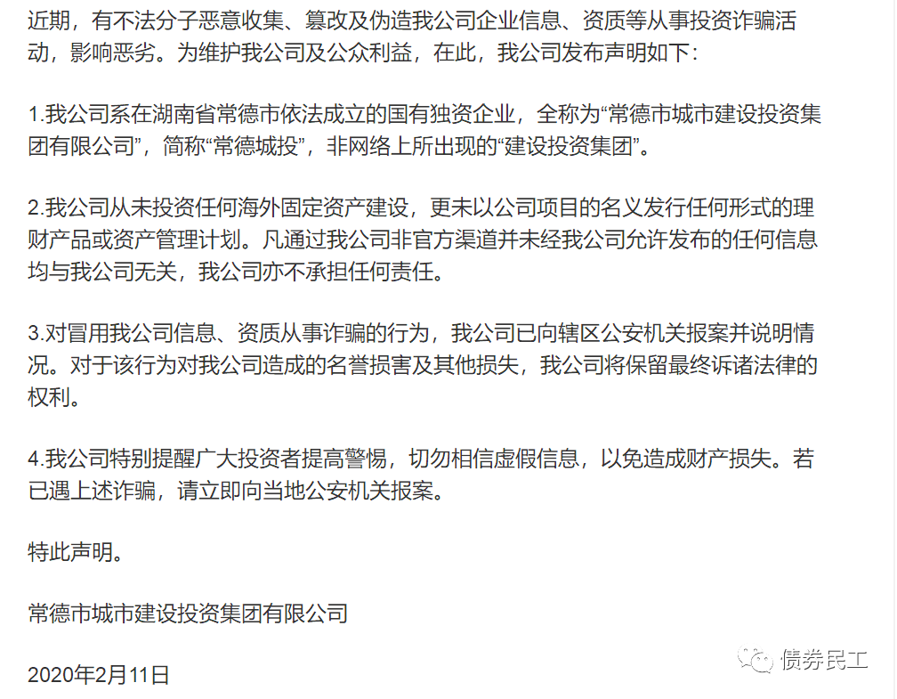 而且在融資之外的其他領域,也有不法分子利用城投公司的名義從事詐騙活動。常德市城市建設投資集團有限公司于2020年2月20日發布聲明稱,不法分子利用公司信息和資質從事投資詐騙活動。