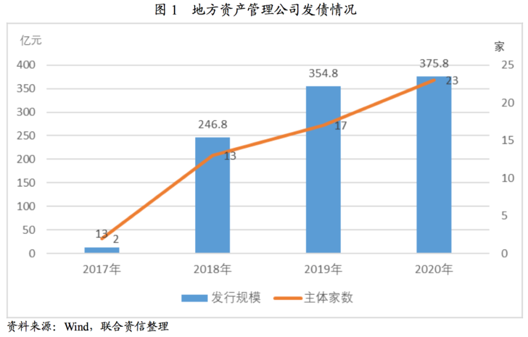 從行業發債情況來看,根據Wind,本文統計了2016年以來債券市場上地方資產管理公司發行債券和債務融資工具情況,2016年未有地方資產管理公司發行;2017年僅有2家地方資產管理公司發行,規模共13.00億元;2018年發行規模激增至246.80億元,之后2019年、2020年發行規模同比分別增長43.76%和5.92%,2020年發行規模為375.80億元,當年發行的地方資產管理公司主體家數也增至23家。不良資產業務與商業銀行不良貸款規模基本正相關,隨著2018年宏觀經濟下行、全行業“去杠桿”等的影響,不良資產融資需求與不良資產規模同步擴張。從發債期限上來看,因不良資產業務周期較長,地方資產管理公司發債期限普遍偏長期,主要為3~5年期,票面利率區間3.10%~7.50%;但近年也逐漸開始有地方資產管理公司發行1年及以內的短期限債券品種來緩解流動性,2019年有2家發行短期品種,2020年增加至7家,短期品種的票面利率區間2.20%~5.00%。