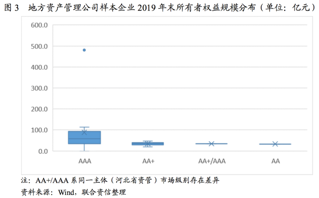 從樣本企業資產規模來看,截至2019年末,主體AAA級別資產規模最大值1619.19億元、最小值106.74億元、平均值379.69億元;AA+級別企業中,資產規模最大值154.39億元,最小值57.08億元;存在級別差異的河北省資管,其資產規模為74.21億元;AA級別僅有一家企業,其資產規模為86.34億元,高于AA+級別最小值。