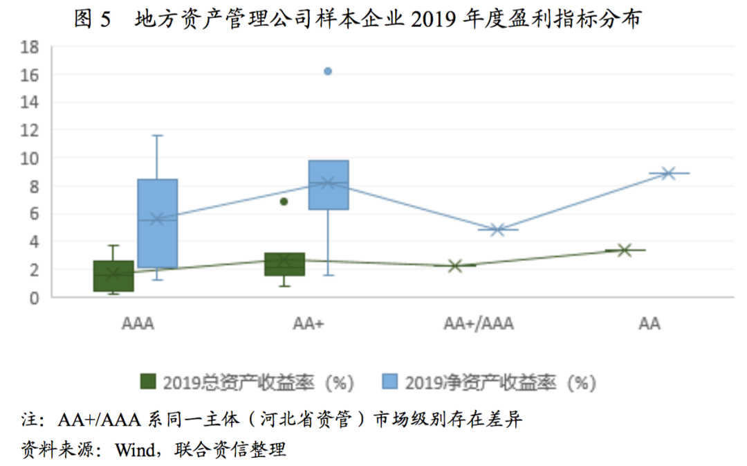 從營業收入和利潤總額來看,2019年,地方資產管理公司中,AAA級別主體的營業收入和利潤總額最大值分別為54.55億元和11.61億元,AA+級別主體中有2家企業的營業收入和利潤總額在AAA序列中能排到靠前位置。AA級唯一主體的營業收入和利潤總額已達AA+收入和利潤水平。值得指出的是,地方資產管理公司對不良資產業務的收入確認方式存在差異,目前普遍有全額法和凈額法2種,導致收入指標差異可能較大,可比性不強,但利潤指標的可比性較好。