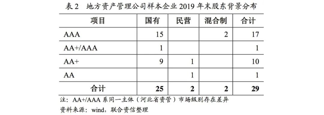 從行業評級情況來看,2019年以來市場上有公開主體級別的地方資產管理公司共29家(統計截至2021年1月末),其中有17家主體信用級別為AAA,10家主體信用級別AA+,1家主體信用級別AA,1家主體存在信用級別差異(系河北省資產管理有限公司,以下簡稱“河北省資管”,AA+中誠信/AAA大公),整體AAA級別的主體家數占有級別主體的比重達60.71%。按照58家地方資產管理公司計算,行業整體評級率50.00%,隨著企業的發展和融資需求的增加,未來參與評級和資本市場融資的地方資產管理公司或將繼續擴容。