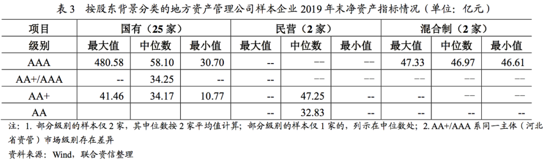 從樣本企業凈資產的區間分布來看,整體上存在一定程度的級別對應梯度關系,且同一級別中,國有背景企業的凈資產最小值顯著低于民營和混合制企業,主要原因是目前市場上對地方資產管理公司評定級別的核心基礎邏輯是地方資產管理公司在化解地方不良資產、維護地方金融穩定方面承擔著一定的社會責任,其所具有的政策性意味著地方資產管理公司在遭遇極端不利情況或債務危機時可能獲得政府的扶持和救助,而國有股權比例是政府扶持可能性的直接體現因素之一。