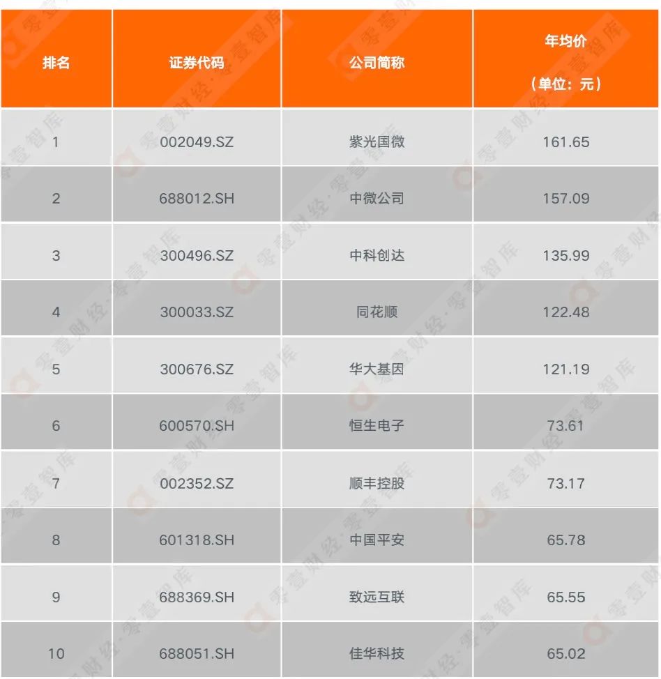 從股價表現上看,在211家區塊鏈上市公司中,紫光國微(002049.SZ)的年均價(時間區間為2020年12月31日至2021年12月31日)最高,為161.65元。除此之外,中微公司(688012.SH)、中科創達(300496.SZ)、同花順(300033.SZ)、華大基因(300676.SZ)等4家公司的年均價也均處在100元以上。