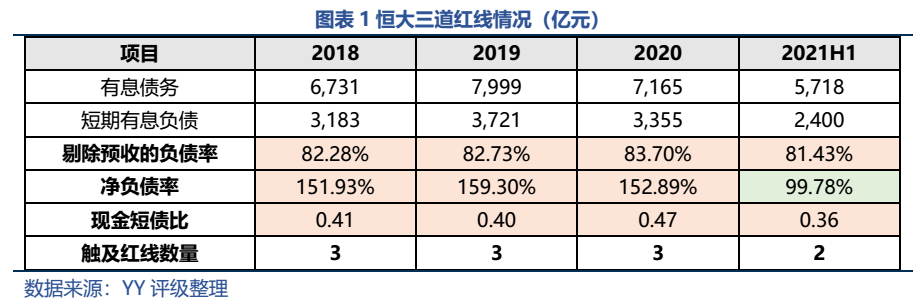 (2)降負(fù)債情況:截至21年6月末,中國恒大有息債務(wù)規(guī)模5,718億元,較去年同期下降了1,447億元。三道紅線指標(biāo)也都實現(xiàn)降低,其中凈負(fù)債率已經(jīng)擠入及格線。