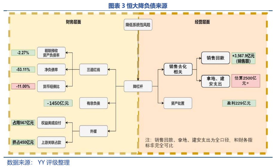 1、有息負(fù)債方面,凈償還了1450億,比恒大地產(chǎn)多還了500億;