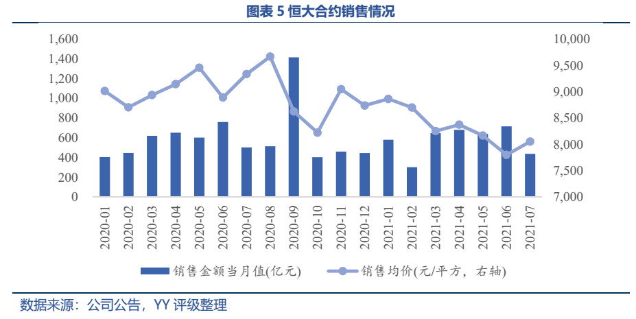 在大面積打折促銷下,恒大今年上半年交樓均價下跌11.2%,20年8月恒大的合約銷售均價曾一度達(dá)9,669.42元/平,近一年內(nèi)呈坡式下滑,21年7月一路跌至8,055.2元/平。