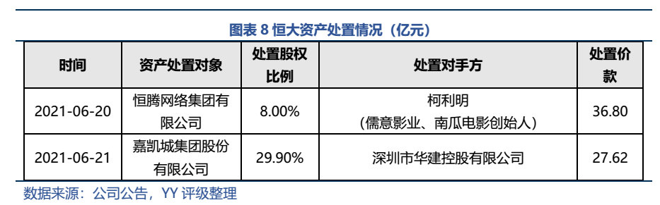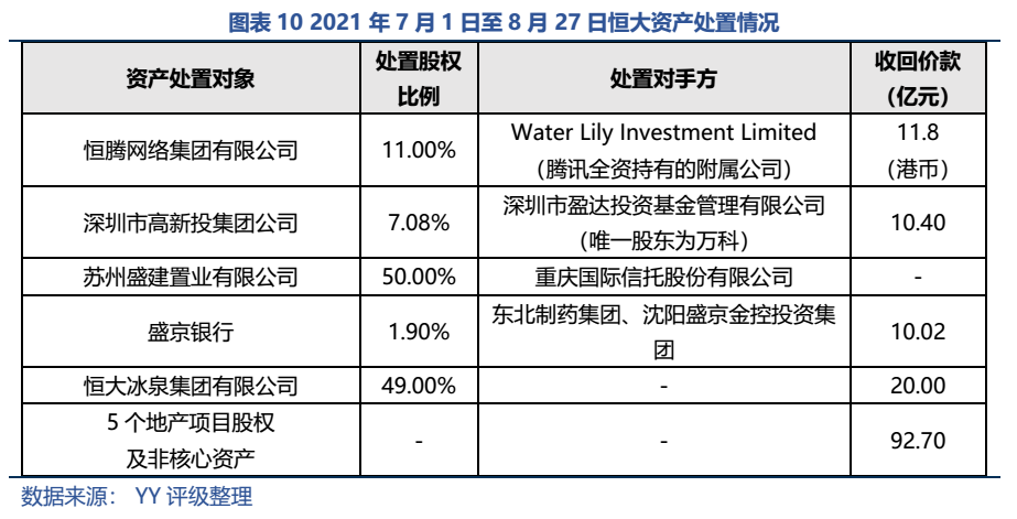 回籠資金仍然是當(dāng)務(wù)之急,7月至8月間,恒大多次出讓股權(quán),累計回籠近143億元。據(jù)傳,后續(xù)恒大旅游集團(tuán)將與地產(chǎn)合并,健康項目劃至汽車,集團(tuán)規(guī)模戰(zhàn)略調(diào)整。集團(tuán)正積極處置非核心資產(chǎn),甚至可能出售物業(yè)板塊、恒大汽車和香港的總部大樓。