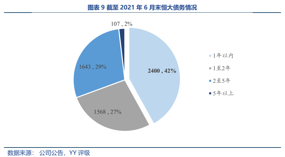 雖然凈負(fù)債率指標(biāo)轉(zhuǎn)綠,但恒大現(xiàn)金短債比卻在不斷惡化。21年6月末恒大總有息債務(wù)規(guī)模為5,717.75億元,42%分布于1年內(nèi)到期,同時,貨幣資金為1,616.3億元,且受限比例達(dá)46%,短期的償債壓力仍是一把項上懸劍。