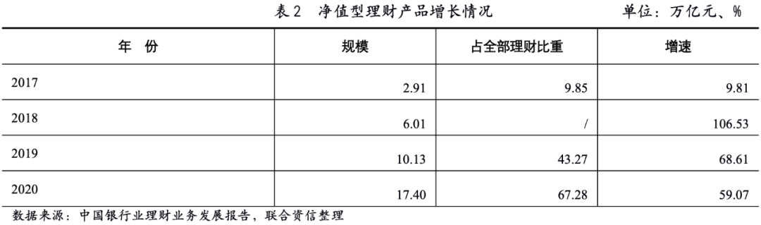 理財產品向凈值化轉型成為重要發展方向。銀行傳統保本理財產品的風險由銀行而并非投資者承擔,理財產品規模的不斷增長使得潛在的剛性兌付壓力日漸增加,并成為制約銀行理財業務發展的主要因素,但資管新規的發布使得理財產品凈值化轉型成為必然趨勢,“剛性兌付”將逐漸被打破。近年來,銀行凈值化理財產品規模快速上升,占全部理財產品的比重增長較為明顯(見表2),理財產品凈值化進程不斷推進。