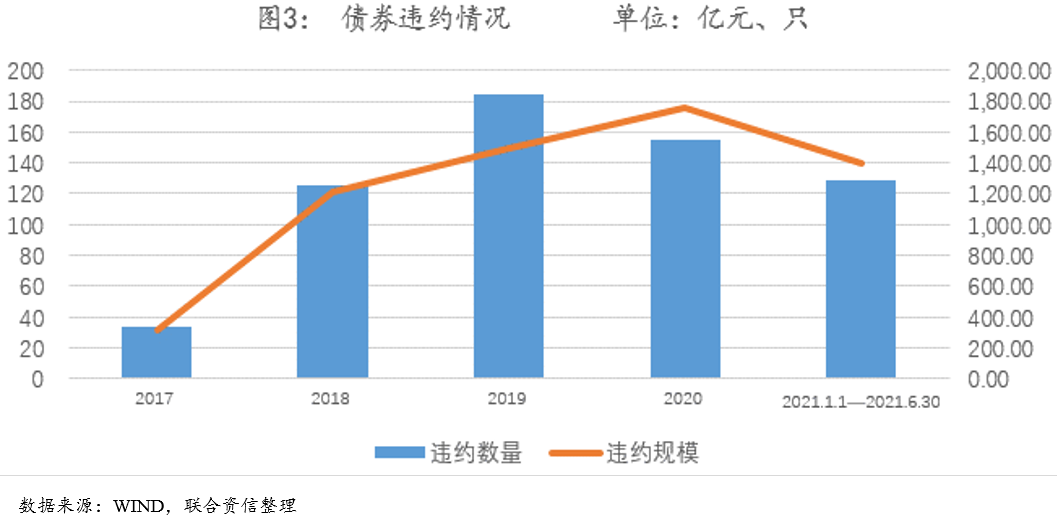 另一方面,現階段我國經濟進入新常態,在國家產業結構持續調整優化、經濟增速放緩的大背景下,資本市場違約事件增多,部分存續非標投資資產面臨的信用風險持續上升。根據wind資訊顯示,2020年共有155只債券發生違約,違約規模合計1757.72億元(見圖3),債券違約規模創造歷史新高;2021年上半年共有129只債券發生違約,違約規模合計1392.50億元。由于中小銀行對非標投資底層資產所涉及的產業、融資方等方面缺乏深入透徹的分析,內部缺乏成熟的評級體系以及風險防控技術,對底層融資方情況的了解通常依賴于公開評級報告或新聞輿情。因此,在信用風險事件頻發的大背景下,中小銀行存續的非標類資產違約的可能性更大。
