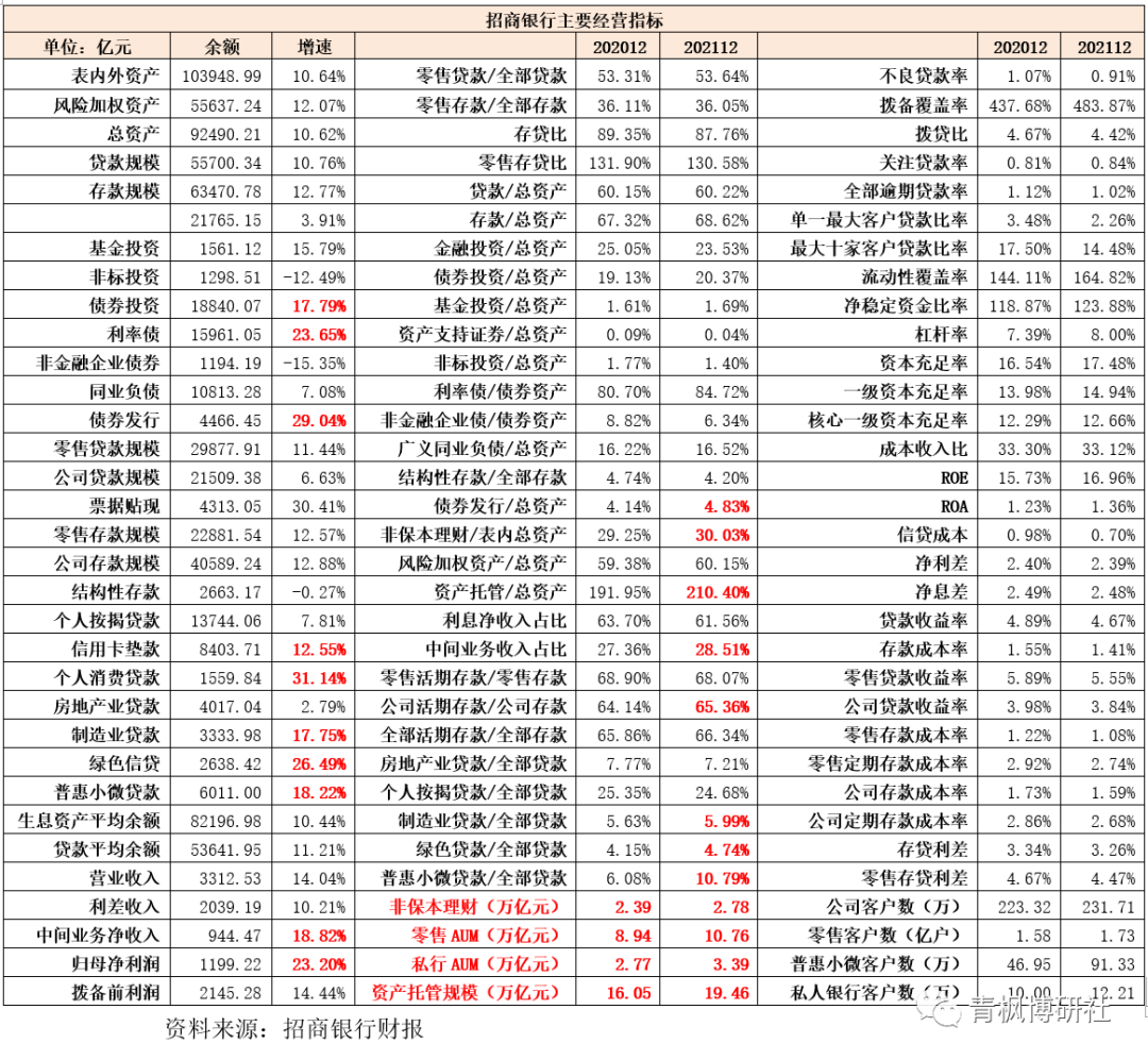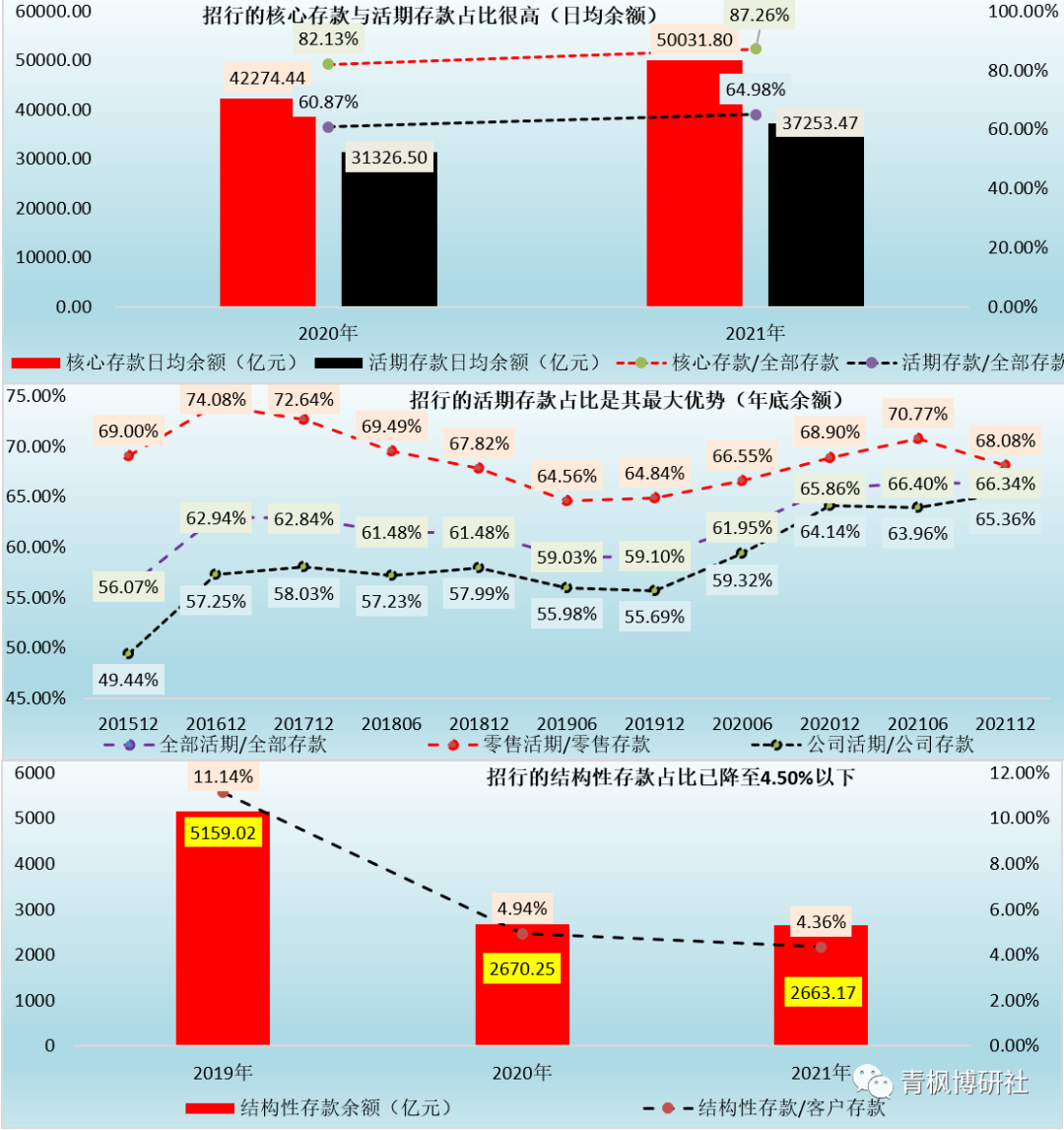 2、核心存款是招行的內(nèi)部考核指標(biāo),主要指剔除大額存單、結(jié)構(gòu)性存款等成本較高的存款。事實(shí)上持續(xù)擴(kuò)大客群規(guī)模、壓降或?qū)Ω叱杀敬婵罨蜻M(jìn)行量?jī)r(jià)管控以優(yōu)化存款結(jié)構(gòu)、應(yīng)對(duì)存款成本剛性上升壓力也是招行2020年以來(lái)的主要任務(wù)。2021年,招行的核心存款日均余額達(dá)到50031.80億元,同比大幅增長(zhǎng)18.92%,占客戶存款日均余額的比例更是高達(dá)87.26%(較2020年大幅提升 5.13個(gè)百分點(diǎn))。這意味著,對(duì)于招行而言,高成本存款占比已不到13%。