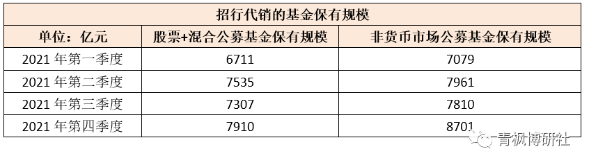 招行對(duì)代銷(xiāo)業(yè)務(wù)的重視還可以看另外一個(gè)數(shù)據(jù),即公募基金的銷(xiāo)售保有規(guī)模,中基協(xié)所公布的基金代銷(xiāo)機(jī)構(gòu)公募基金銷(xiāo)售保有規(guī)模數(shù)據(jù)顯示,招行于2021年四個(gè)季度代銷(xiāo)的非貨幣市場(chǎng)公募基金保有規(guī)模分別為7079億元、7961億元、7810億元和8701億元,其中股票+混合公募基金保有規(guī)模分別為6711億元、7535億元、7307億元和7910億元。
