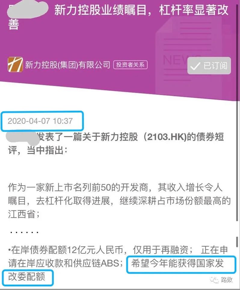 按照官方的通報簡訊,新力地產在2020年4月和機構投資者們密集開了會。關于申請發外債額度的信息,估計是在那時對外釋放的。