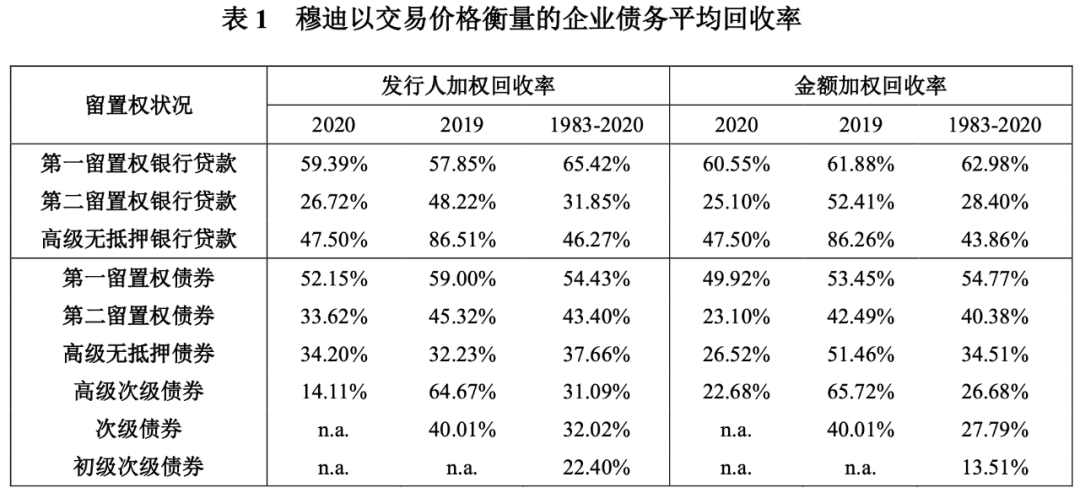 此外,報告附件中還列示了從1983年以來違約企業債及貸款的年度回收率水平。以2020年度報告為例(詳見表3),2020年基于交易價格的高級無抵押債券的回收率水平為34.20%。