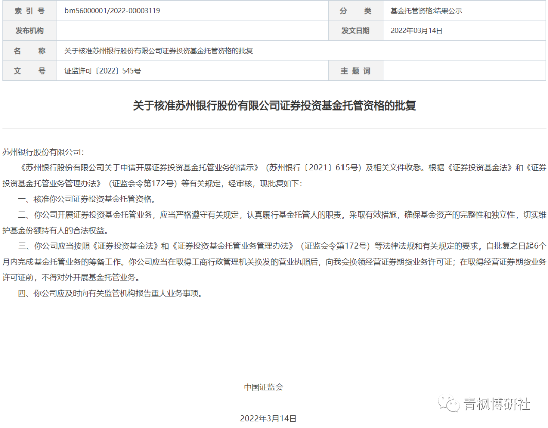 1、2022年3月14日,證監(jiān)會核準了蘇州銀行的證券投資基金托管資格,這是2014年5月江蘇銀行獲批基金托管資格以來,獲得基金托管資格的首家內(nèi) 資行,意味著內(nèi)資行獲得基金托管牌照的大門再次打開。