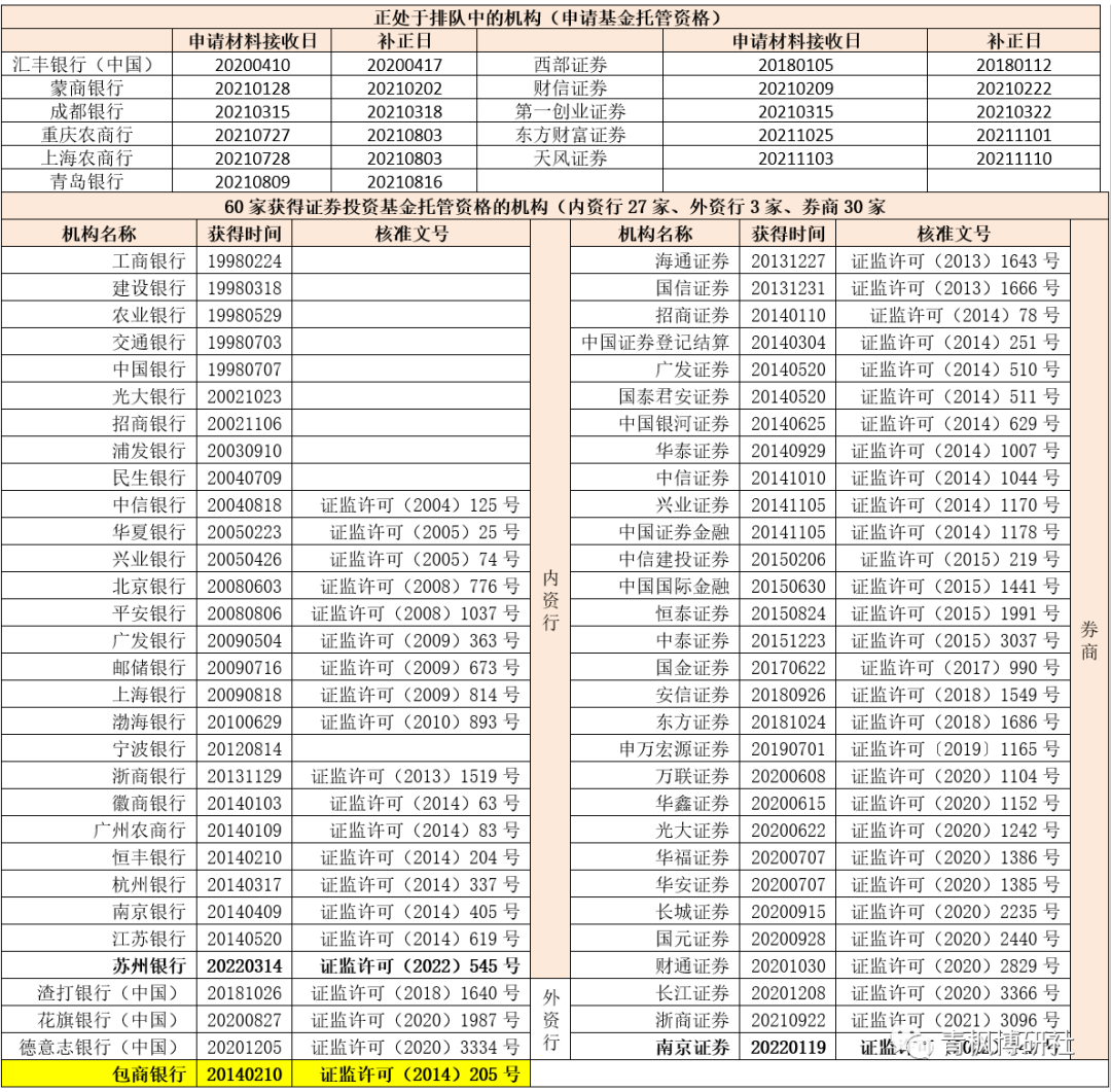 除上述60家已獲得基金托管資格的機構外,還有11家正處于申請基金托管資格的排隊序列中,具體包括5家內(nèi)資行、1家外資行和5家券商。