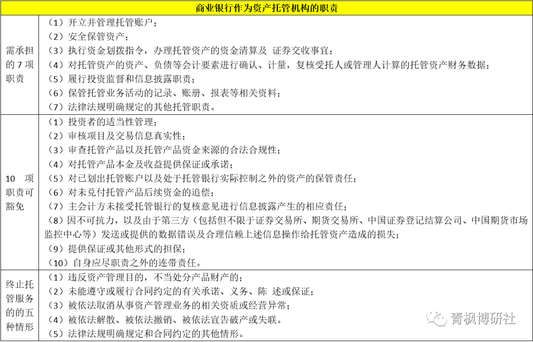 《商業(yè)銀行資產(chǎn)托管業(yè)務指引》明確商業(yè)銀行的托管職能主要包括資產(chǎn)保管服務、賬戶服務、會計核算(估值)服務、資金清算服務、交易結算服務、投資監(jiān)督服務、信息披露服務以及其它。