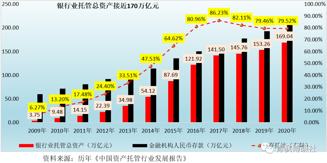 2、與之相對比,較高的托管規(guī)模增長步伐也有效提升了存托比,其從2009年的不到10%提升至2017年的86.23%。隨后在強監(jiān)管的背景下,資管產(chǎn)品出現(xiàn)一定程度的萎縮,托管規(guī)模的增長步伐有所放緩,使得存托比亦相應下降至2018年的82.11%和2019年的79.46%,2020年則微幅抬升至79.52%。