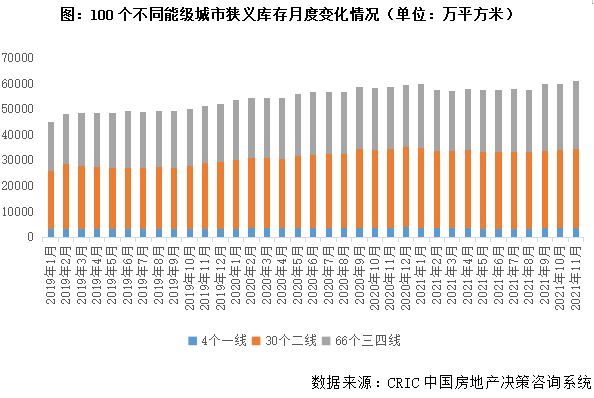 2021年因成交“先升后降”的行情,整體去化周期走勢也呈現出“先穩后增”態勢:1-7月基本持穩在10-12個月,8月隨著成交轉淡,去化周期開始逐月跳增,至11月末已達16.96個月。分能級來看,一線韌性較強,去化周期由去年年末的9.51個月上漲至12.23個月,顯著低于百城平均。二三線穩中有增,尤其是三四線城市,自5月開始去化周期步入陡增階段,由5月末的10.83個月波動上行至11月末的19.2個月。