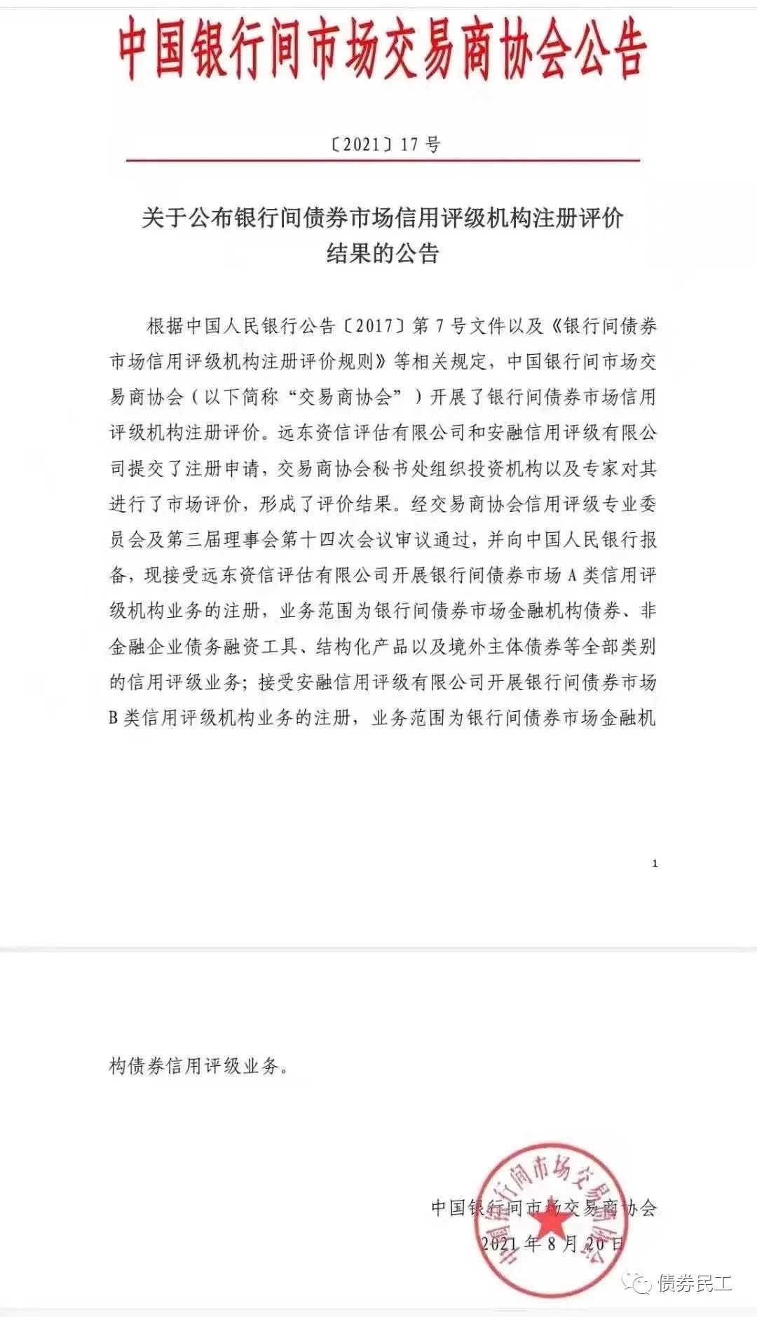 根據(jù)銀行間市場(chǎng)交易商協(xié)會(huì)2021年8月20日披露的《關(guān)于公布銀行間債券市場(chǎng)信用評(píng)級(jí)機(jī)構(gòu)注冊(cè)評(píng)價(jià)結(jié)果的公告》,遠(yuǎn)東資信評(píng)估有限公司被評(píng)定為A類(lèi)信用評(píng)級(jí)機(jī)構(gòu),可以從事金融債券、非金融企業(yè)債務(wù)融資工具、結(jié)構(gòu)化產(chǎn)品和境外主體債券的評(píng)級(jí);安融信用評(píng)級(jí)有限公司被評(píng)定為B類(lèi)信用評(píng)級(jí)機(jī)構(gòu),可以從事金融債券的評(píng)級(jí)。