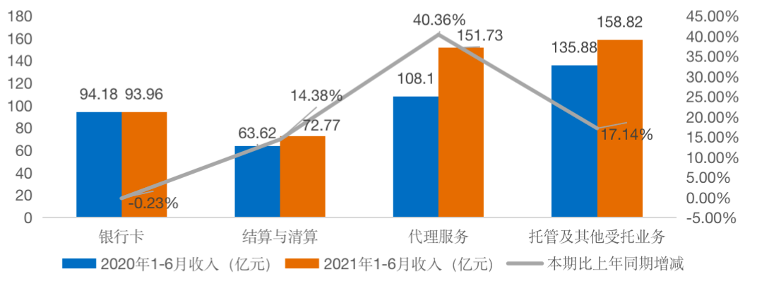 2021年上半年,招商銀行實現非利息凈收入694.08億元,同比增長20.75%,主要得益于托管及其他受托業務傭金收入、代理服務手續費的快速增長,即大財富管理業務的貢獻。其中,代理服務收入費由108.1億元增至151.73億元,增幅達40.36%;托管及其他受托業務傭金由135.88億元增至158.82億元,增幅達17.14%。